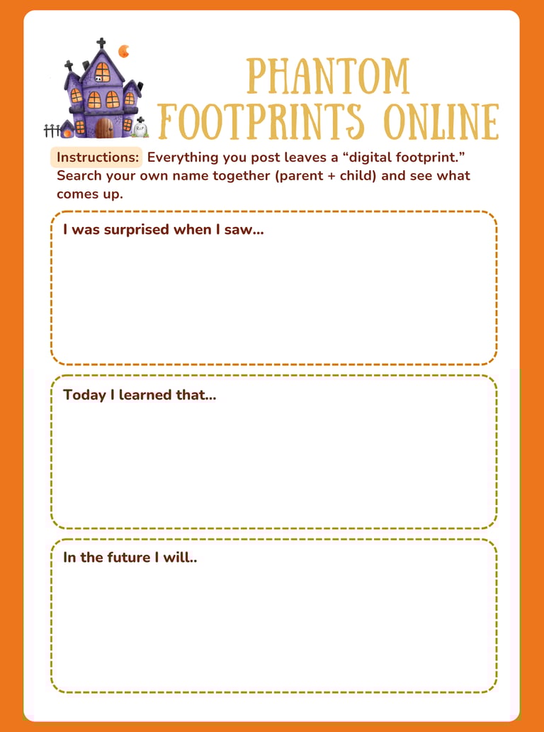 Just like ghosts leave behind phantom footprints, everything we post online—pictures, comments, likes, even old accounts—leaves a trail that others can see. Teaching kids about this concept early helps them understand that the internet is forever, and what they share now may resurface later.