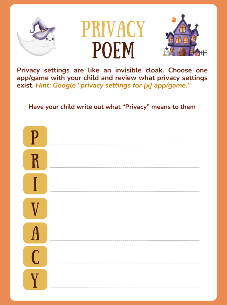 Show your child how to toggle privacy controls, and explain why these settings matter.Write a Privacy Poem.