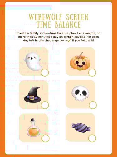 Cyber-smart parenting isn’t about banning devices, it’s about teaching balance. The “Werewolf Screen Time Balance” challenge makes screen-time limits fun instead of a battle, while sneaking in a little Halloween magic.