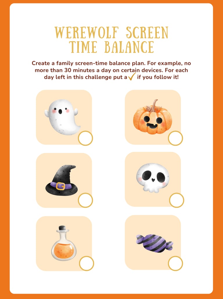 Gamify it – Pretend each completed day “defeats a werewolf.” At the end of the challenge, your family earns the title of “Screen Time Monster Slayers.”